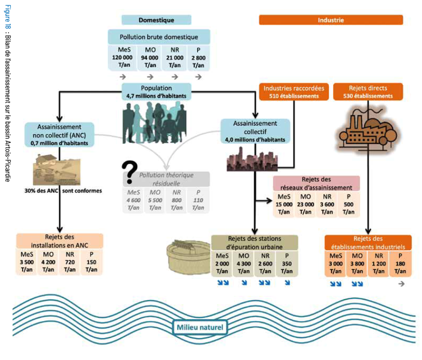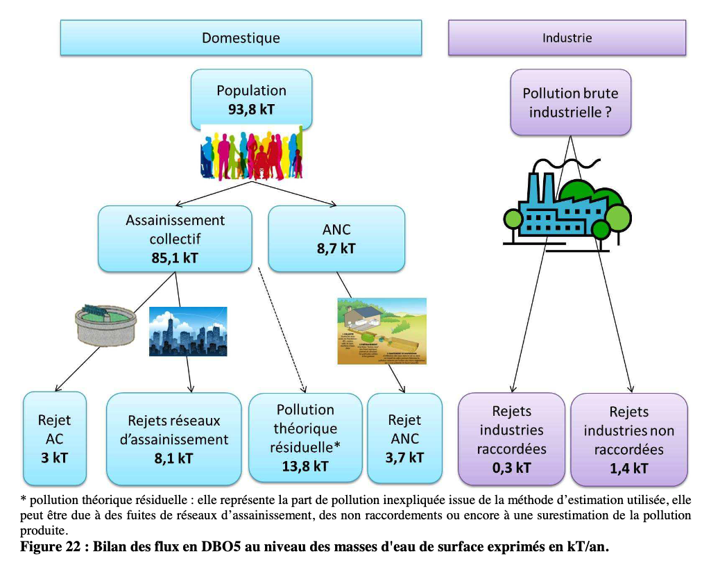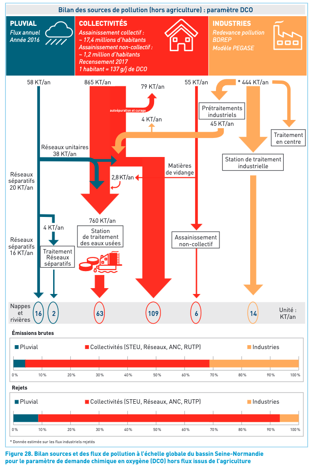 Pollution discharged directly by sewers networks (in pink) represents (with 0.8 uncertainty in the global flows if we count residual pollution in grey):