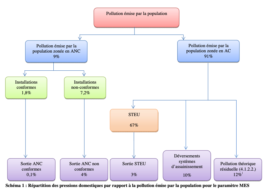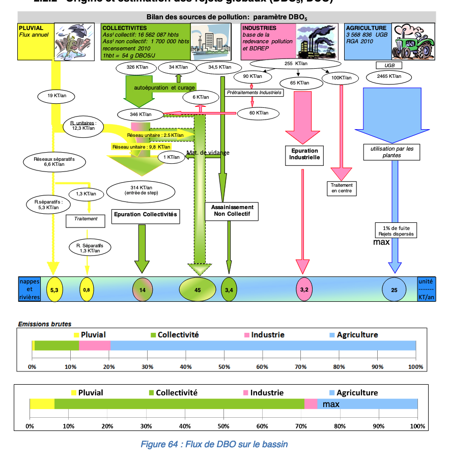 For Seine-Normandie Etat des lieux, there is genarally a discrepancy concerning estimated pollution from direct discharge depending on the type of pollution considered. All expressed as % of pollution entering the WWTP: