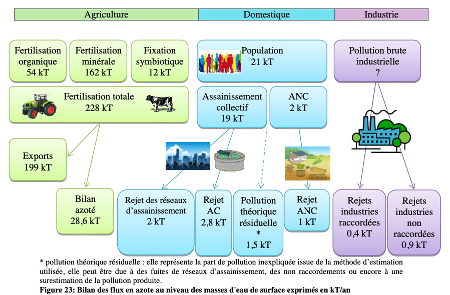 Similarly to the Artois-Picardie basin (previous tab), we were communicated data on water flows in A1 and A2 points, and we have studied the Etat des lieux experts assessment report. Values are around 15-25%, we keep 20% as an order of magnitude.