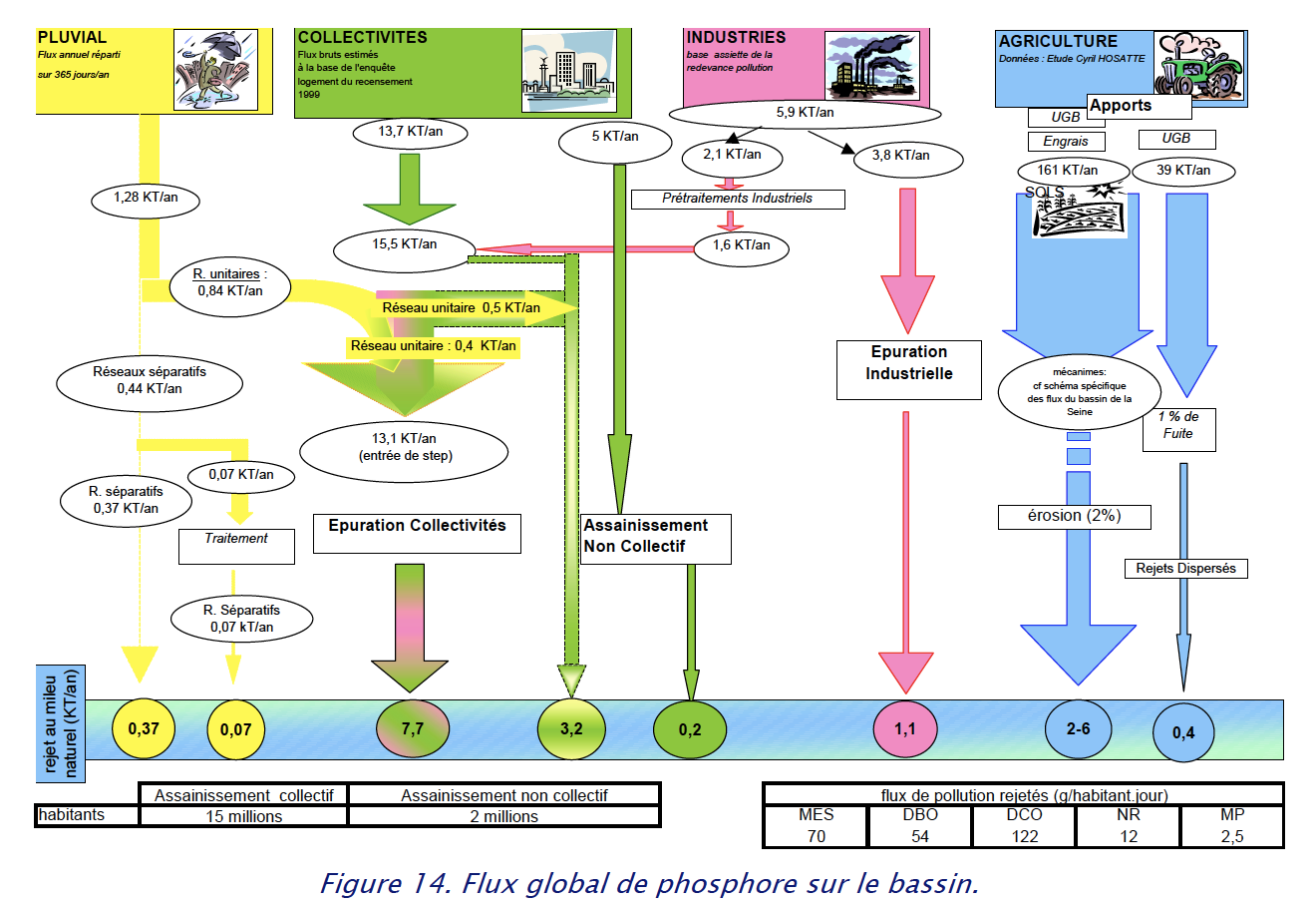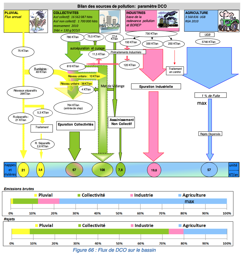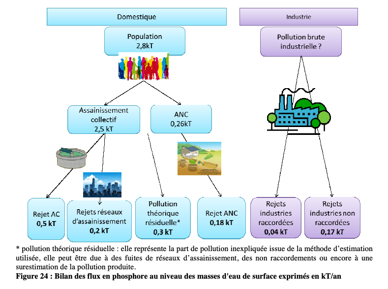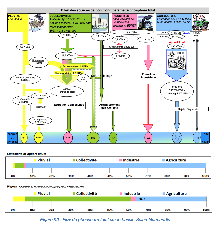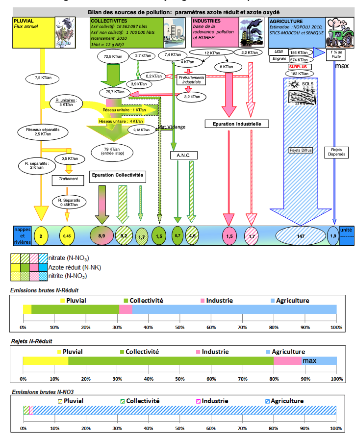 Pollution discharged directly by sewers networks (in pink) represents (with 0.1 uncertainty in the global flows if we count residual pollution in grey):