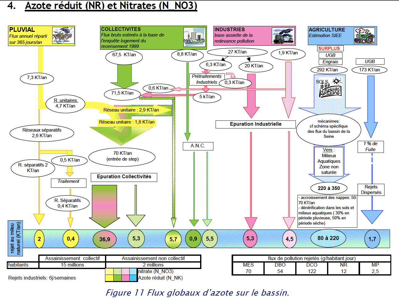 Pollution discharged directly by sewers networks (in pink) represents (with 4.6 uncertainty in the global flows if we count residual pollution in grey):